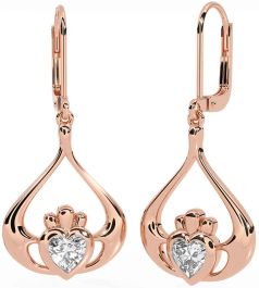 Diamond Rose Gold Silver Claddagh Dangle Earrings