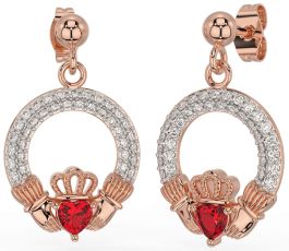 Diamond Ruby Rose Gold Claddagh Dangle Earrings