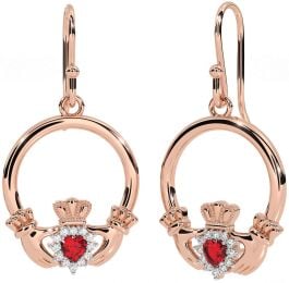 Diamond Ruby Rose Gold Silver Claddagh Dangle Earrings