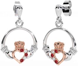 Diamond Ruby Rose Gold Silver Claddagh Dangle Earrings