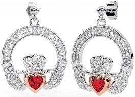 Diamond Ruby Rose Gold Silver Claddagh Dangle Earrings