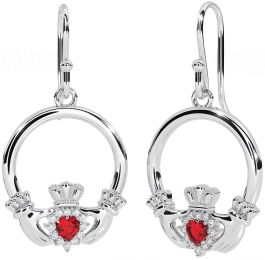 Diamond Ruby White Gold Claddagh Dangle Earrings