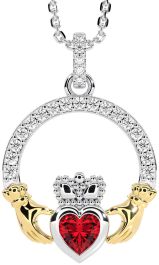 Diamond Ruby White Yellow Gold Claddagh Necklace