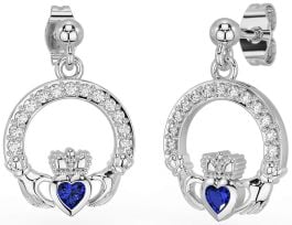 Diamond Sapphire Silver Claddagh Dangle Earrings