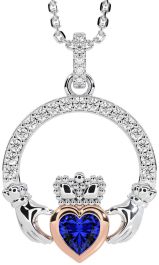 Diamond Sapphire White Rose Gold Claddagh Necklace