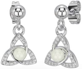 Diamond Silver Celtic Trinity Knot Pearl Dangle Earrings