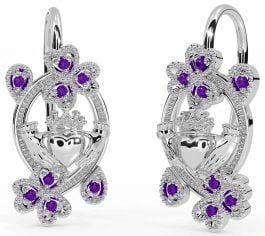 Diamond Silver Claddagh Shamrock Dangle Earrings