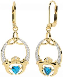 Diamond Topaz Gold Claddagh Celtic Trinity Knot Dangle Earrings