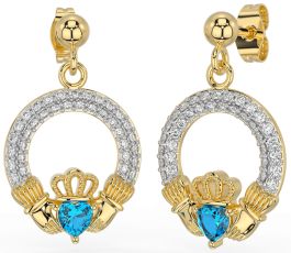 Diamond Topaz Gold Claddagh Dangle Earrings