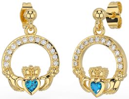 Diamond Topaz Gold Silver Claddagh Dangle Earrings