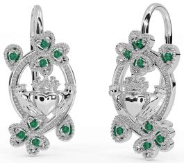 Diamond White Gold Claddagh Shamrock Dangle Earrings