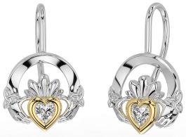Diamond White Yellow Gold Claddagh Celtic Trinity Knot Dangle Earrings