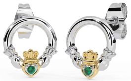Emerald Gold Silver Claddagh Stud Earrings