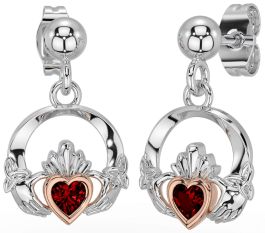 Garnet Rose Gold Silver Celtic Claddagh Trinity Knot Dangle Earrings