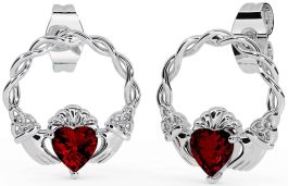 Garnet White Gold Celtic Claddagh Trinity Knot Stud Earrings