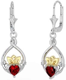 Garnet White Yellow Gold Celtic Claddagh Dangle Earrings