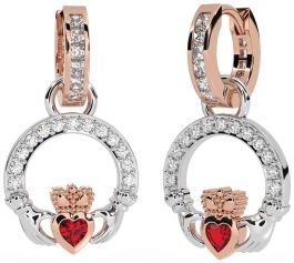 Diamond Ruby Rose Gold Silver Claddagh Dangle Earrings