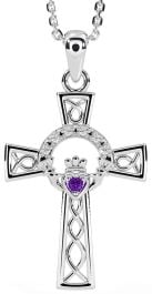 Diamond Amethyst Silver Claddagh Celtic Cross Necklace