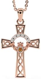 Diamond Citrine Rose Gold Claddagh Celtic Cross Necklace