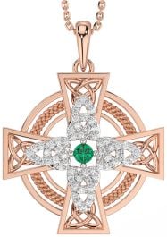 Large Diamond Emerald Rose Gold Celtic Cross Necklace