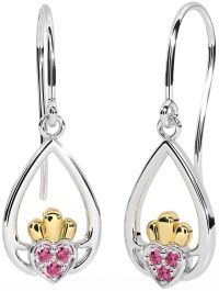 Pink Tourmaline Gold Silver Claddagh Dangle Earrings
