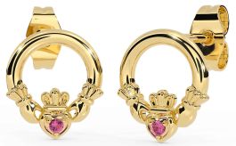 Pink Tourmaline Gold Silver Claddagh Stud Earrings