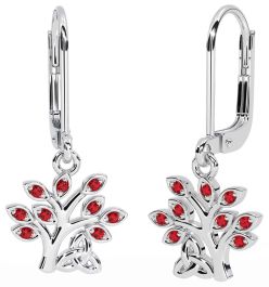 Ruby White Gold Celtic Tree of Life Trinity Knot Dangle Earrings