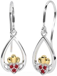 Ruby White Yellow Gold Claddagh Dangle Earrings