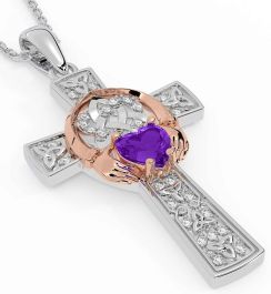 Diamond Amethyst Rose Gold Silver Claddagh Trinity Knot Celtic Cross Necklace